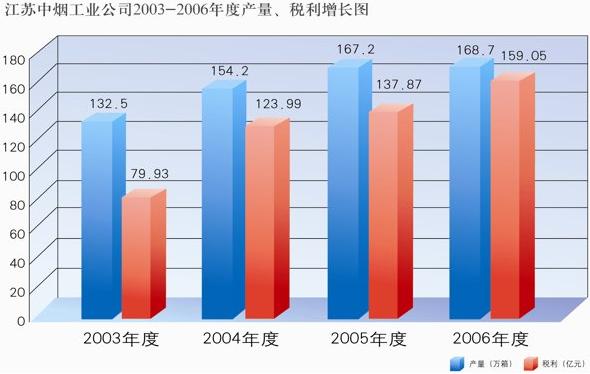 自2003年开始,公司卷烟产销量连续六年平均年递增6%;创税利连续六年平均年递增21%。2009年产销卷烟184.7万箱,实现税利249.23亿元。